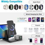 With 30W high-speed output, it delivers up to 15W for iPhones, 10W for iPads, 3W for AirPods, and 2W for Apple Watch, ensuring rapid power delivery. The MagSafe-compatible magnets provide a strong, secure hold for precise alignment (iPhone 12+), while universal compatibility extends to iPhone 12-15, Apple Watch (Series 1-8), AirPods (2-5 gen), and other Qi-enabled devices.